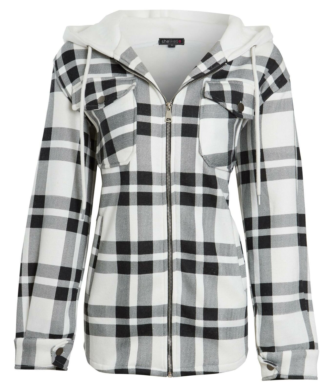 Thick Checket Shacket With Zip And Hood. Colour Block Check Print. Zipped Hooded Style. Front And Side Pockets. Approx Length - 27.5'' / 70cm. 65% Polyester, 35% Cotton. Machine Washable