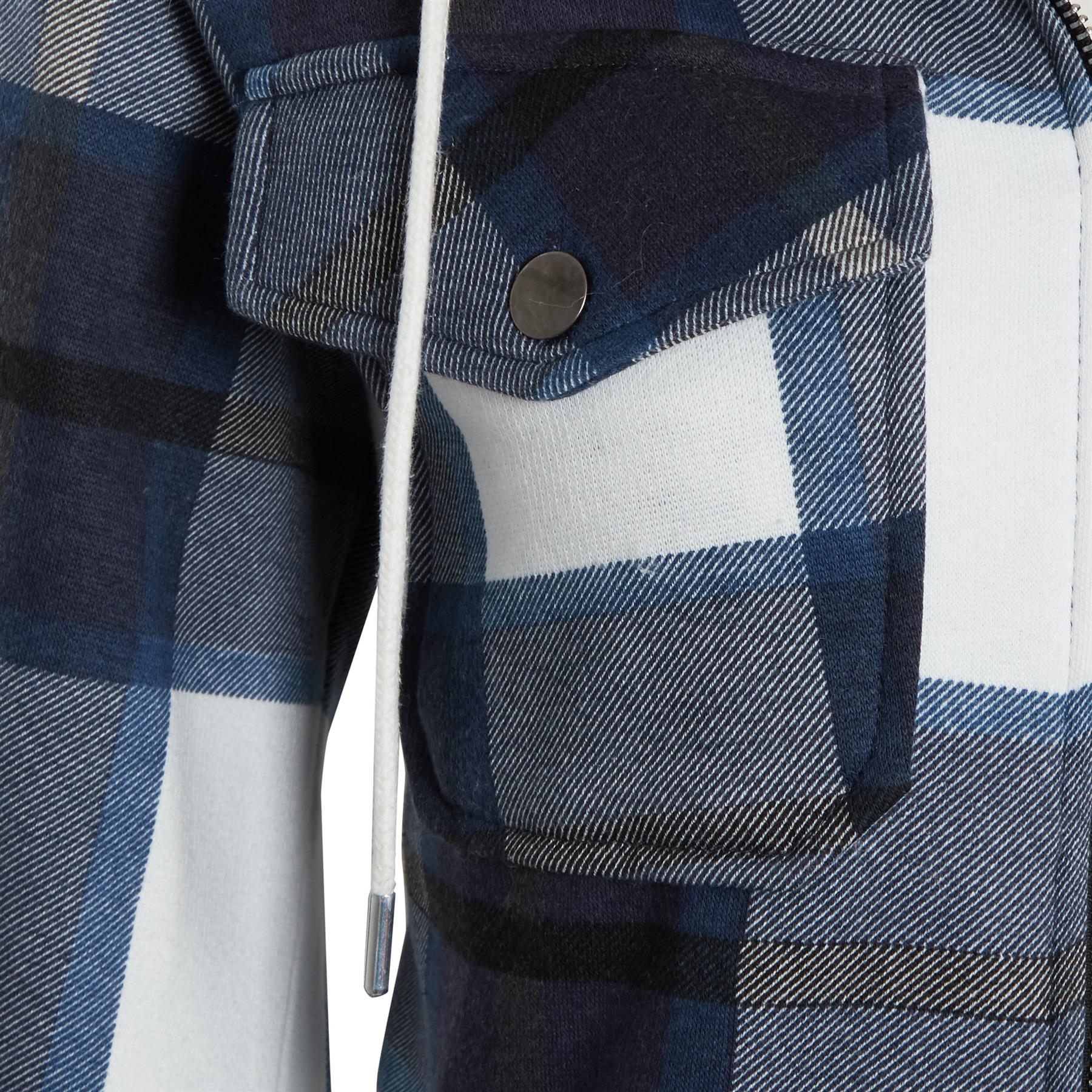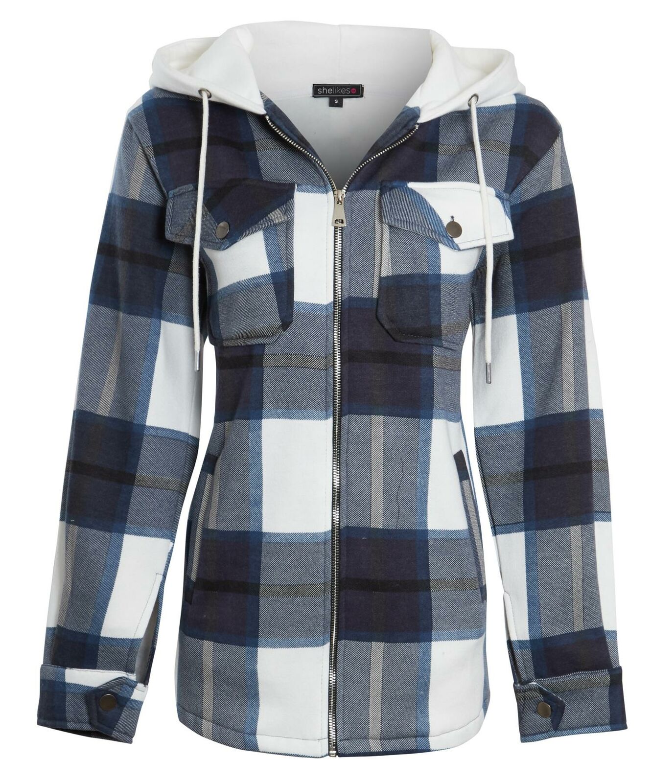 Womens Check Fleece Zip Up Hooded Shacket - Navy